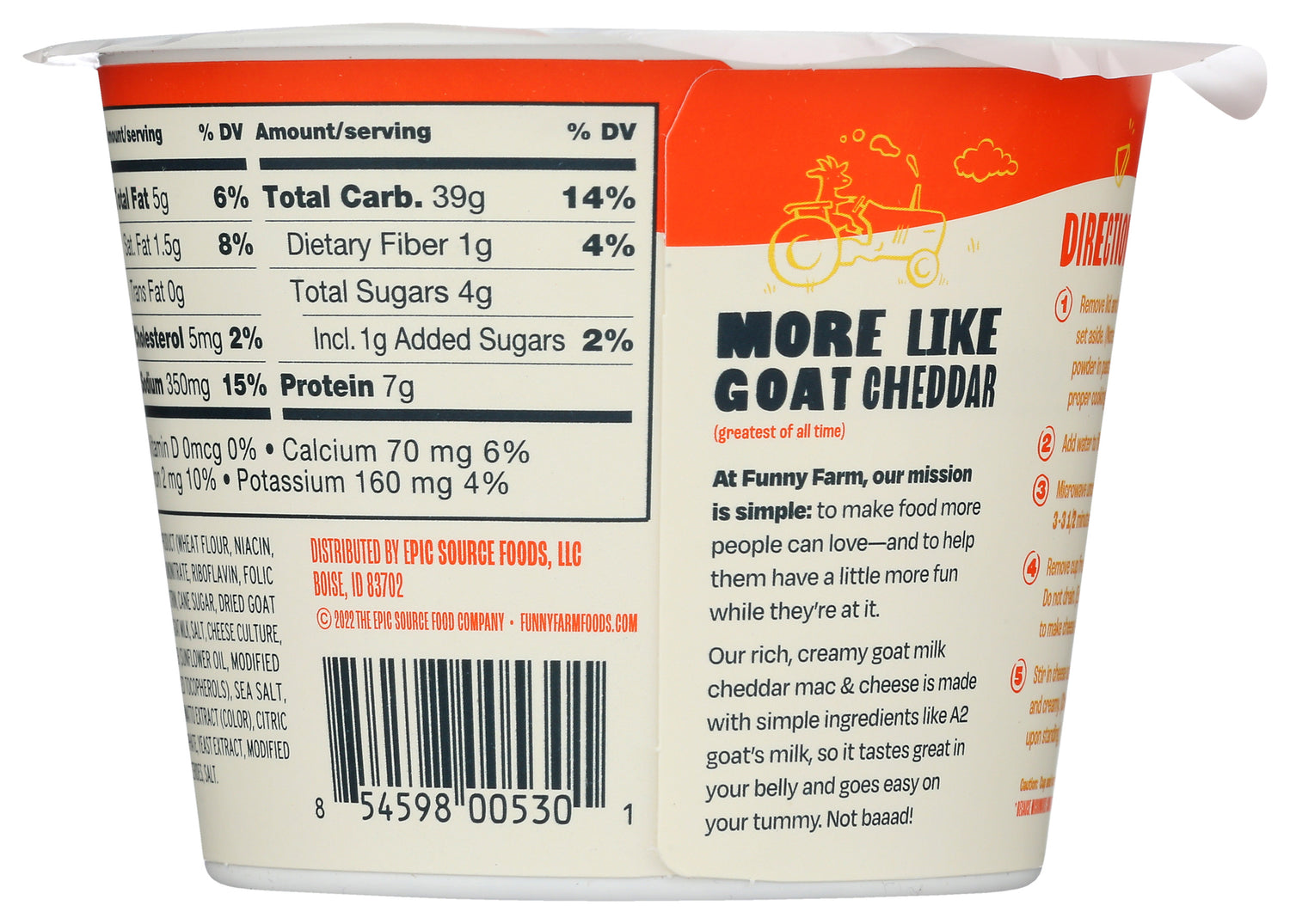 Ultra-creamy and outrageously cheesy, our Goat Cheddar Mac & Cheese is packed with melty goodness in every bite. Add your own favorite goat or plant-based milks and butters to our oodles of noodles for a fresh new approach to comfort food. At Funny Farm, we know goat cheese cheddar makes everything better!