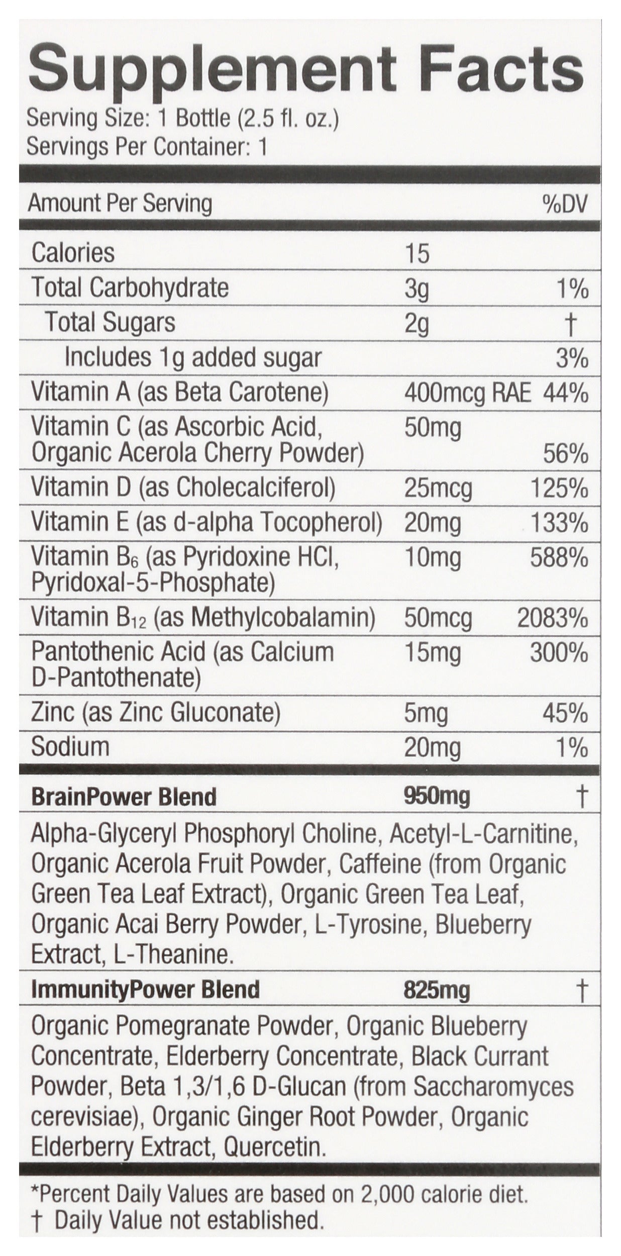 Our BRAINJUICE IMMUNITY POMEGRANATE ACAI 2.5oz Ready to Drink brain supplement is a great tasting way to enhance your cognitive performance and immune response. Packed with our BrainPower Blend and our ImmunityPower Blend that includes ingredients such as Black Currant, Organic Elderberry, Arionaberry, Vitamin A, Vitamin C, Vitamin D, Vitamin E, Zinc, Organic Ginger Root, and superfoods Pomegranate and Acai, this ready to drink supplement is a powerful way to support your brain health and immune system daily.