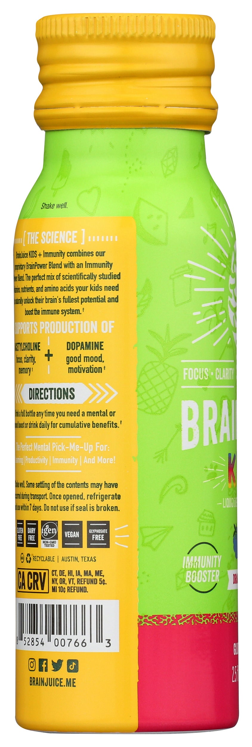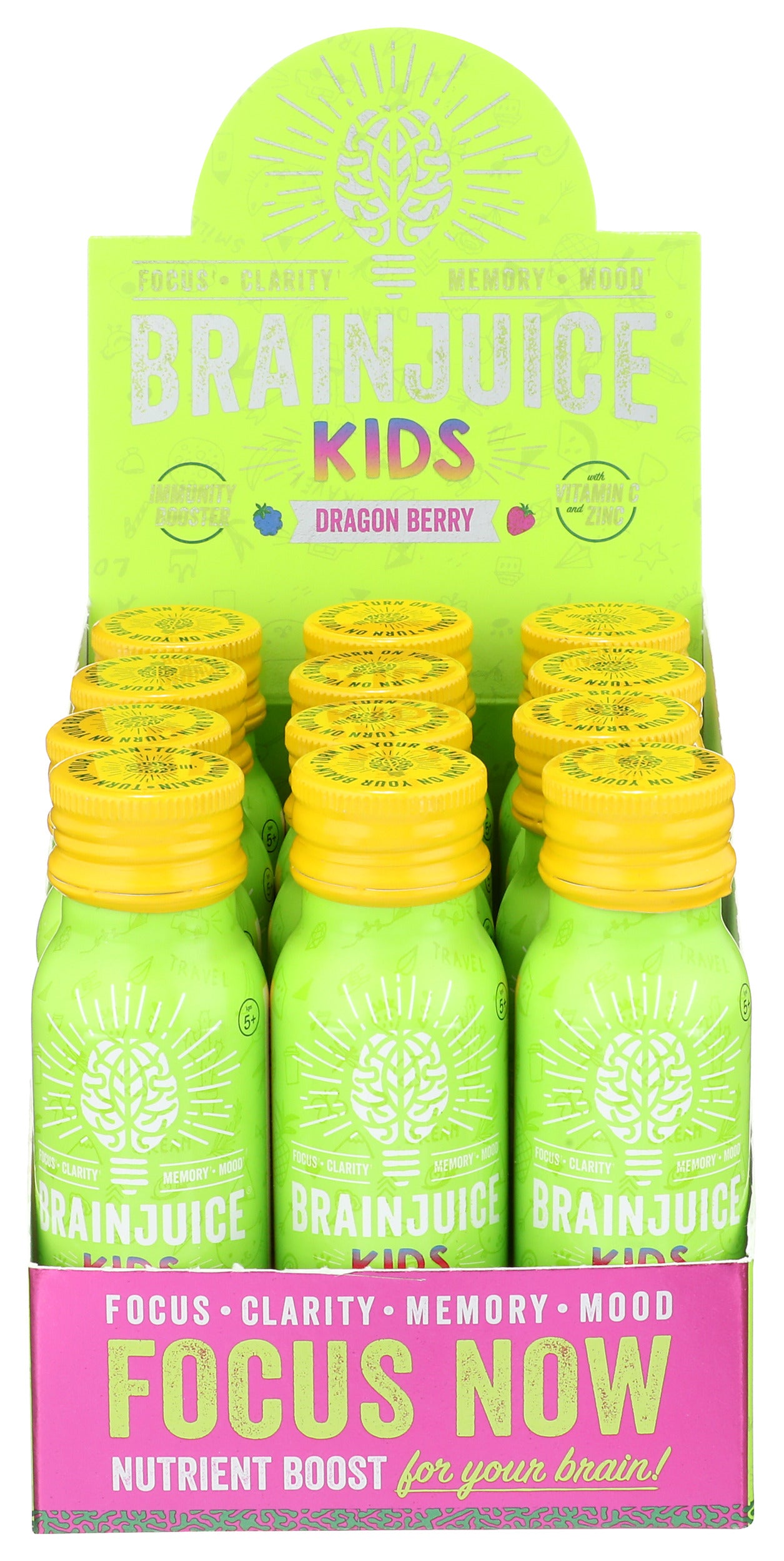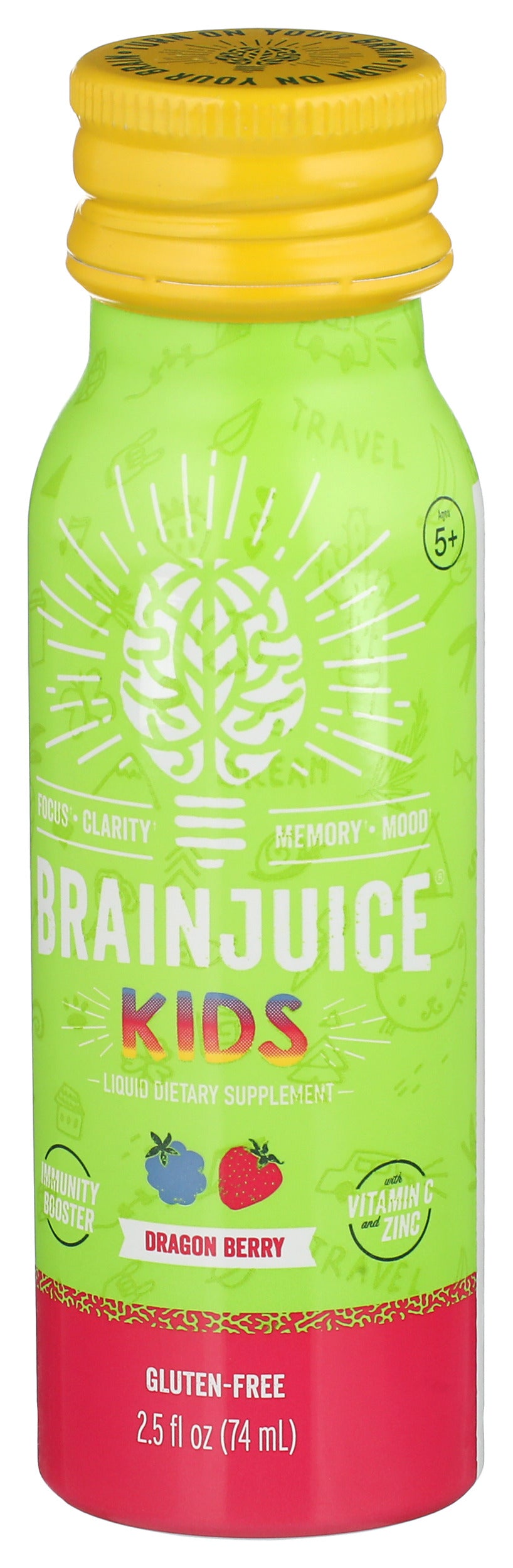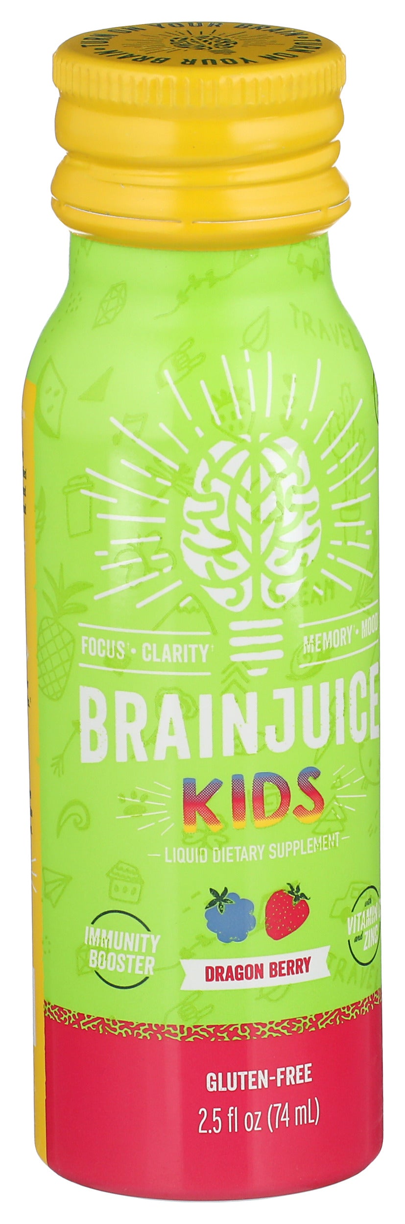 Our BRAINJUICE KIDS + IMMUNITY DRAGONBERRY 2.5 oz., a ready-to-drink supplement, combines our proprietary BrainPower blend with our ImmunityPower Blend of vitamins, superfoods, nutrients, and amino acids. It's a delicious, all-natural, gluten-free way for kids ages 5+to get their daily vitamins while also naturally unlocking the fullest potential of their brains and boosting their immune systems.