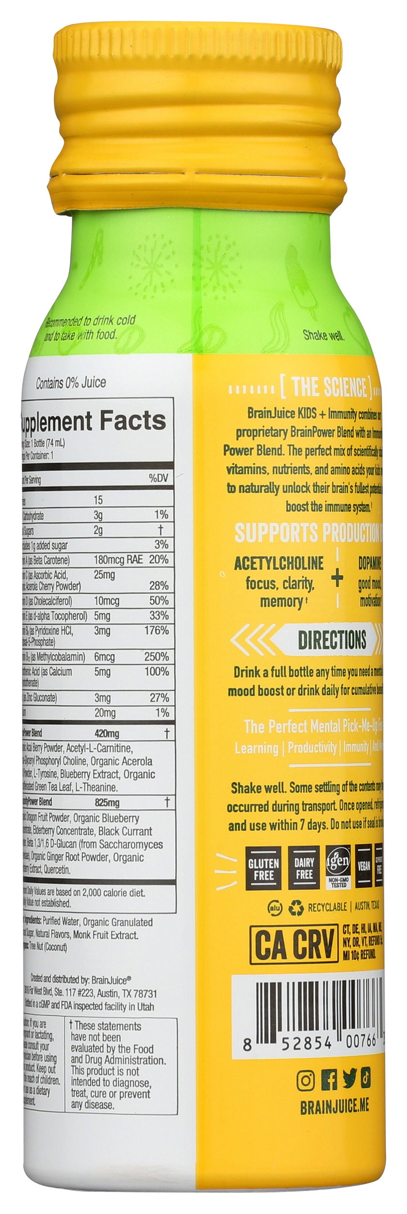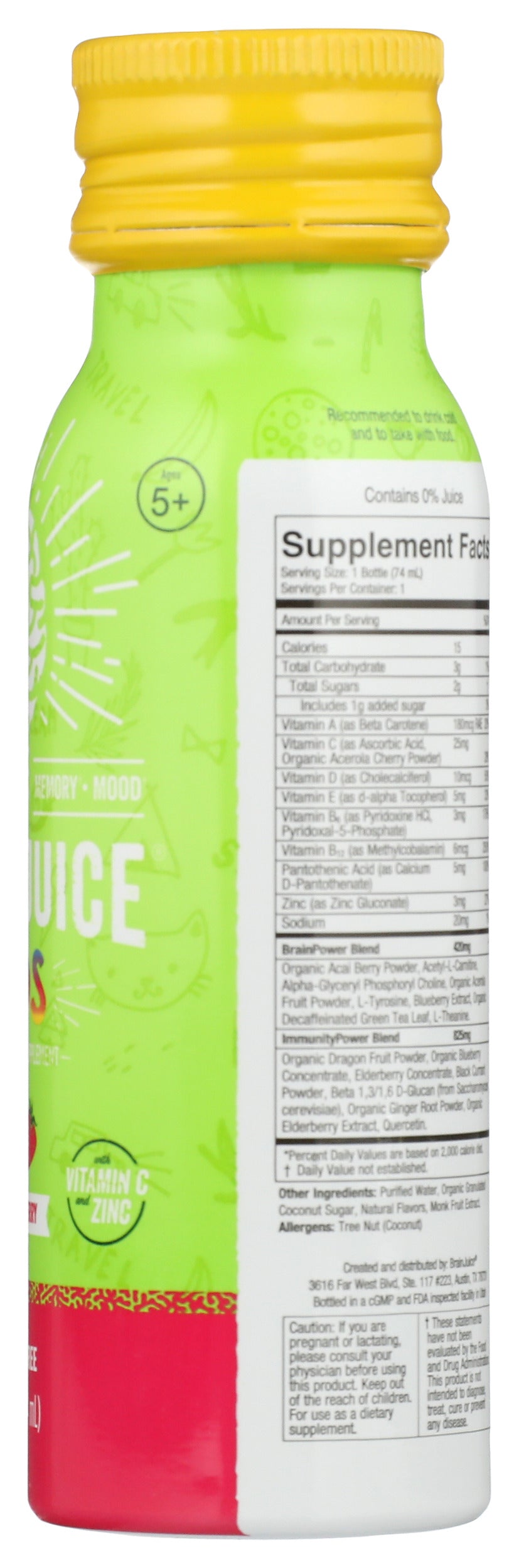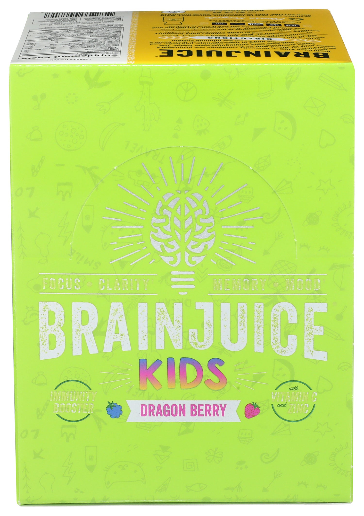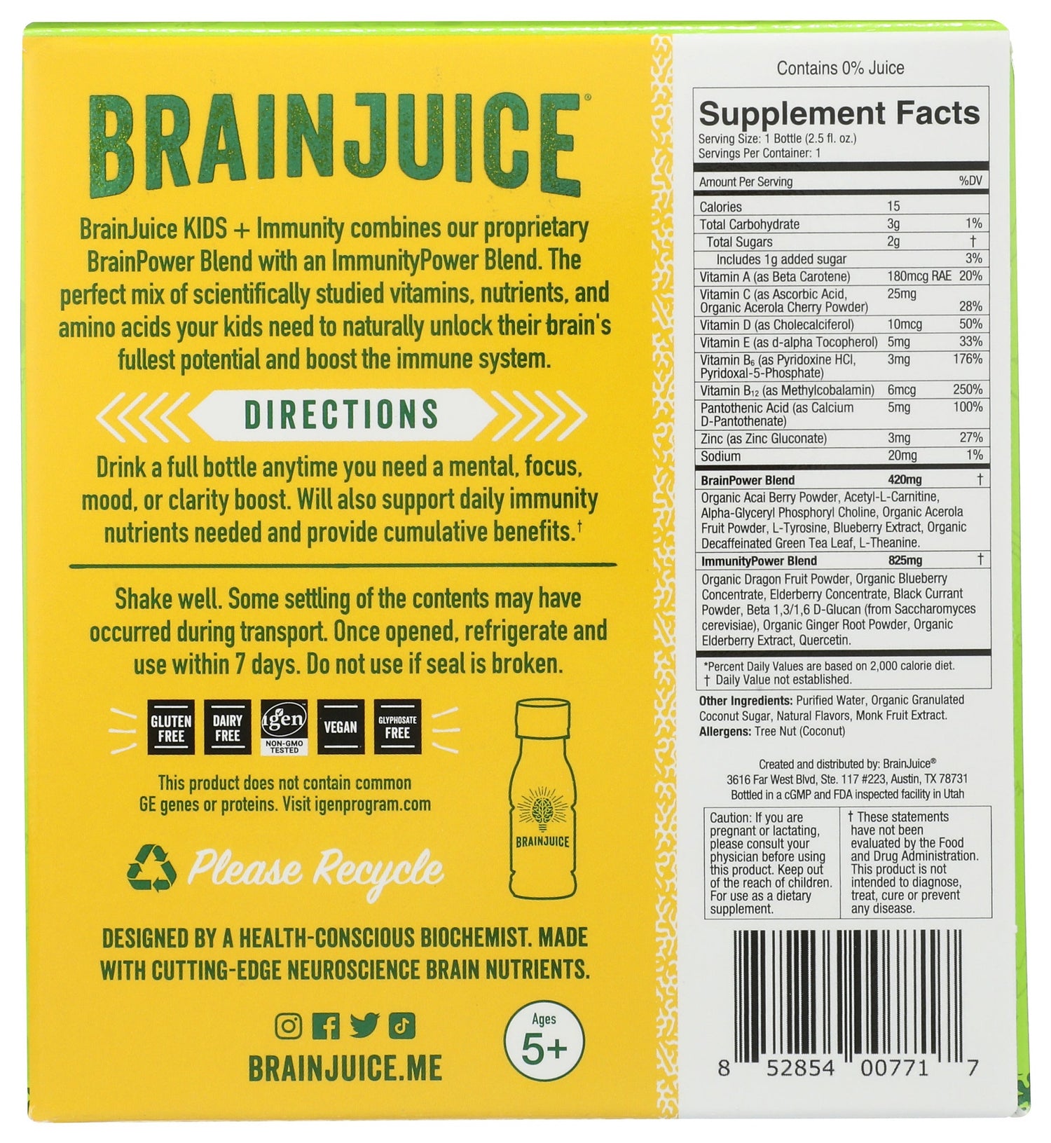 Our BRAINJUICE KIDS + IMMUNITY DRAGONBERRY 2.5 oz., a ready-to-drink supplement, combines our proprietary BrainPower blend with our ImmunityPower Blend of vitamins, superfoods, nutrients, and amino acids. It's a delicious, all-natural, gluten-free way for kids ages 5+to get their daily vitamins while also naturally unlocking the fullest potential of their brains and boosting their immune systems.