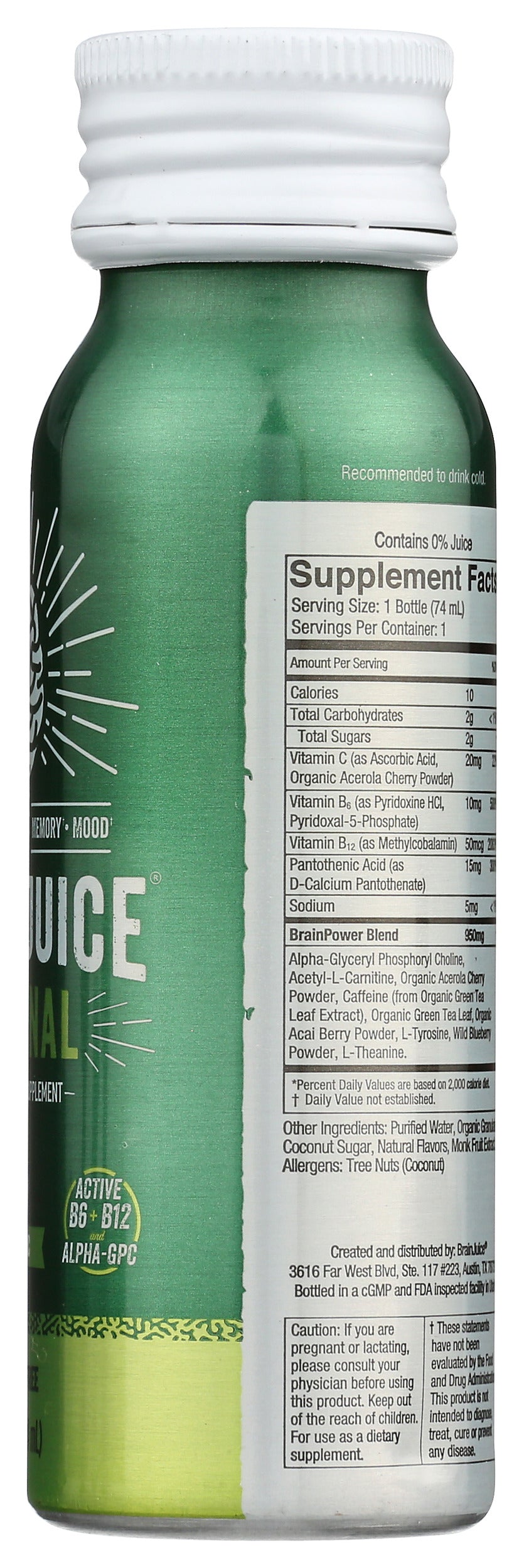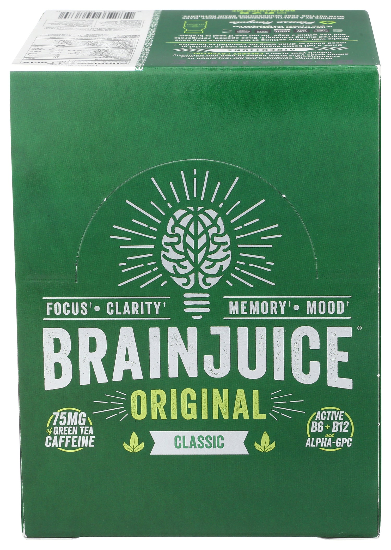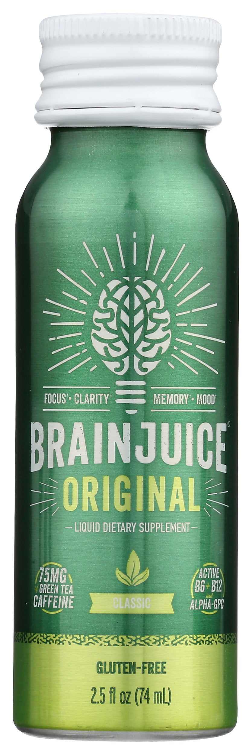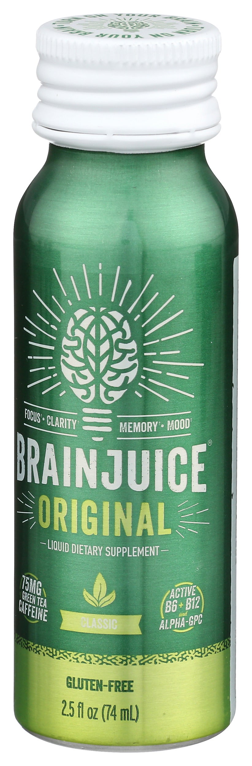 Packed with our proprietary BrainPower blend of superfoods, vitamins, Alpha-GPC, Organic Green Tea Leaf Caffeine, and sweetened with 2g of Coconut Sugar and Monk Fruit Extract, our BRAINJUICE ORIGINAL CLASSIC 2.5oz ready-to-drink brain supplement is a delicious way to support your neurotransmission, focus, clarity, memory, mood, and cognitive performance daily.