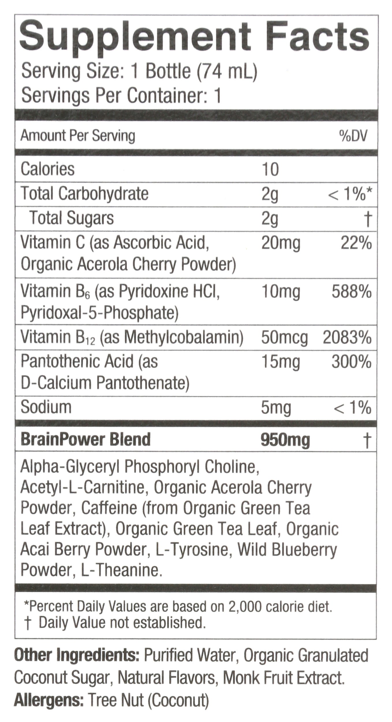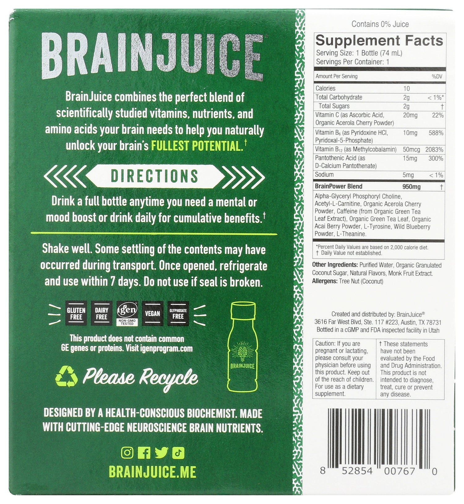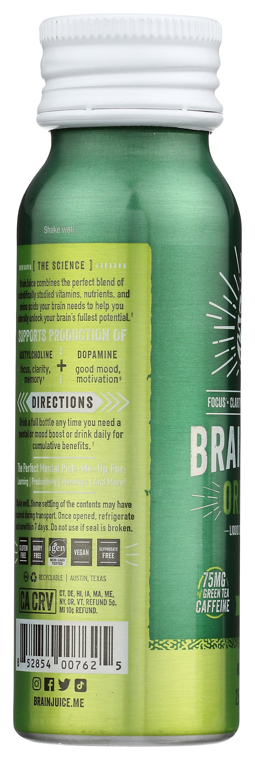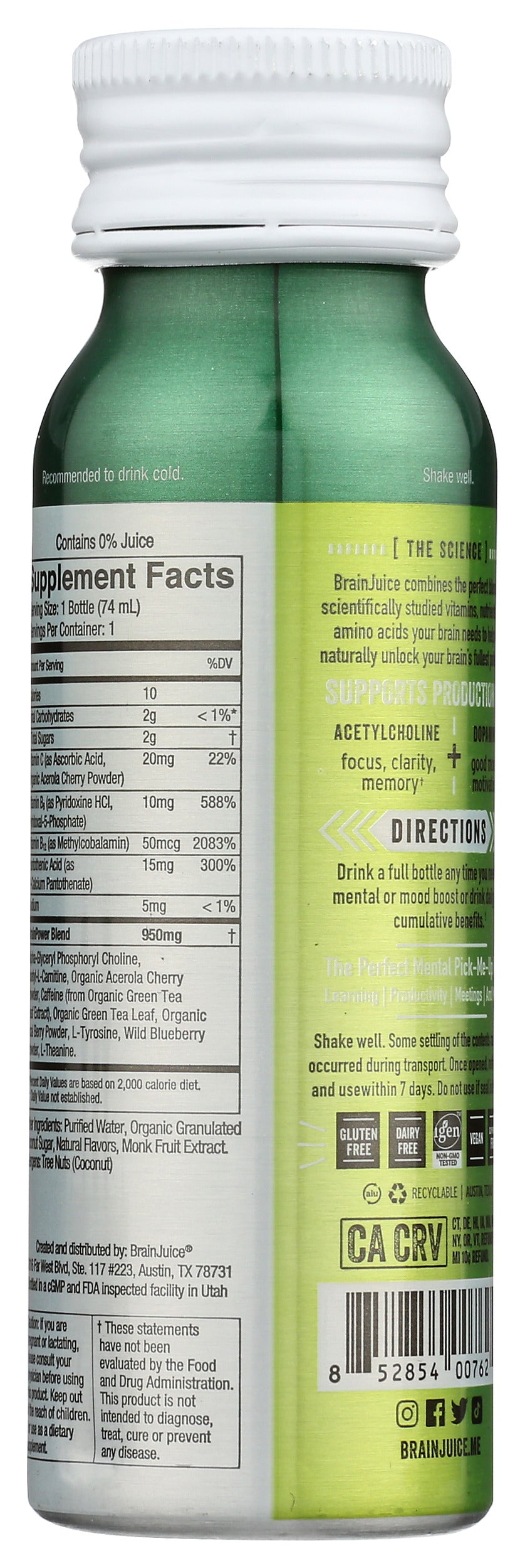 Packed with our proprietary BrainPower blend of superfoods, vitamins, Alpha-GPC, Organic Green Tea Leaf Caffeine, and sweetened with 2g of Coconut Sugar and Monk Fruit Extract, our BRAINJUICE ORIGINAL CLASSIC 2.5oz ready-to-drink brain supplement is a delicious way to support your neurotransmission, focus, clarity, memory, mood, and cognitive performance daily.