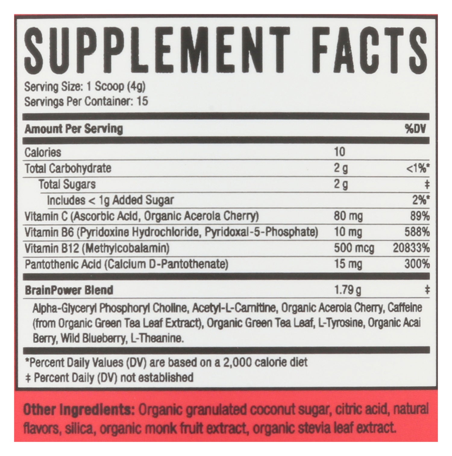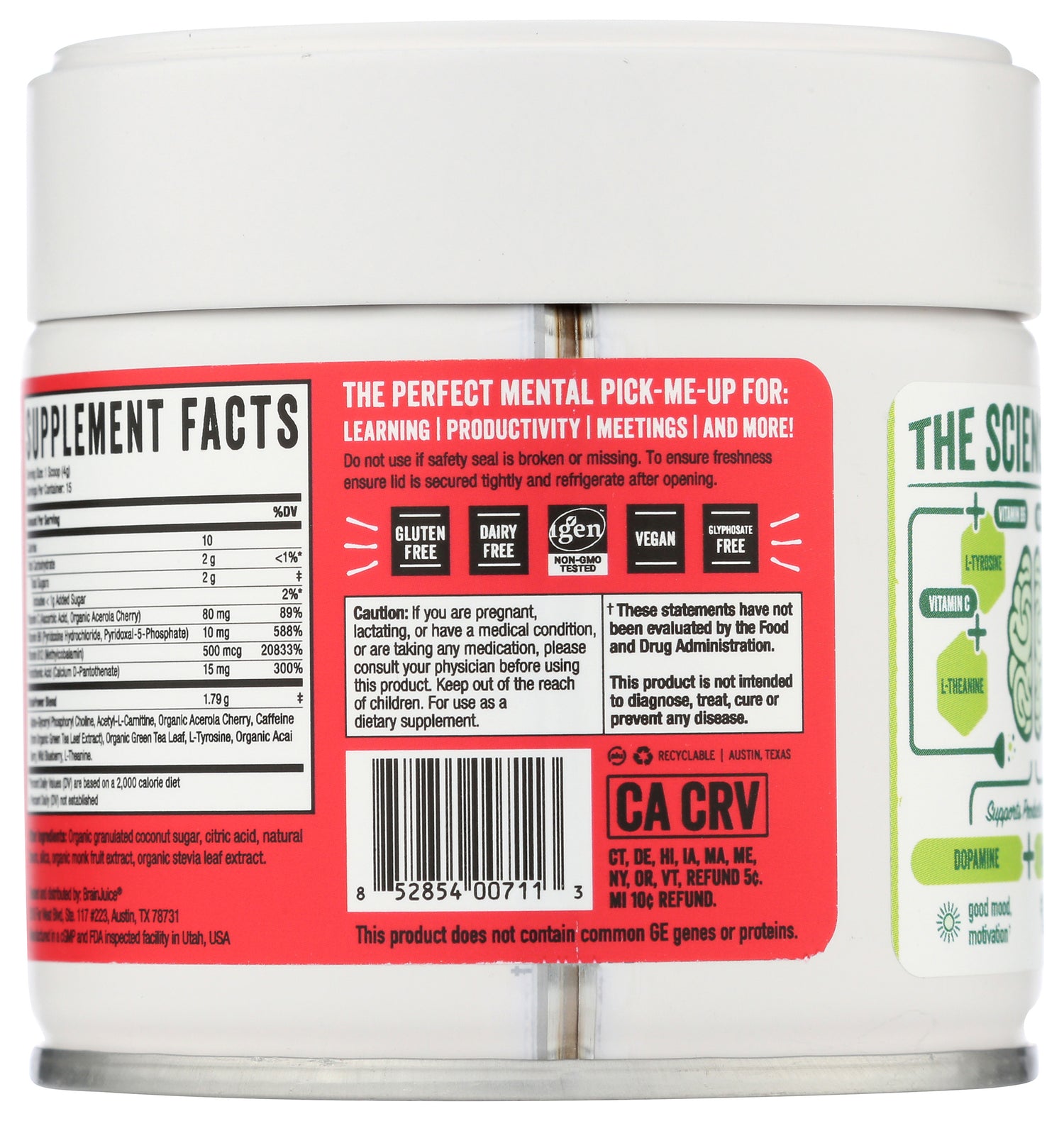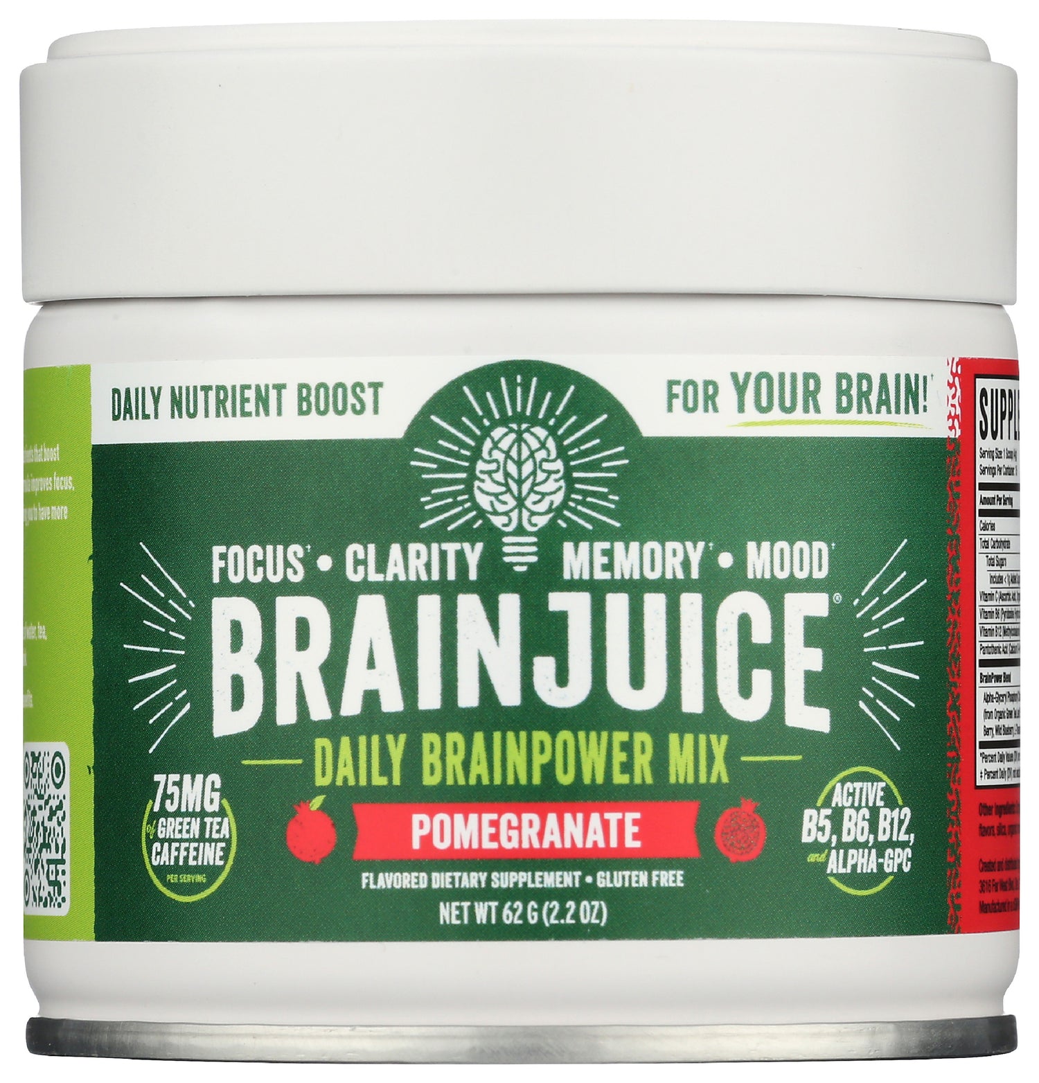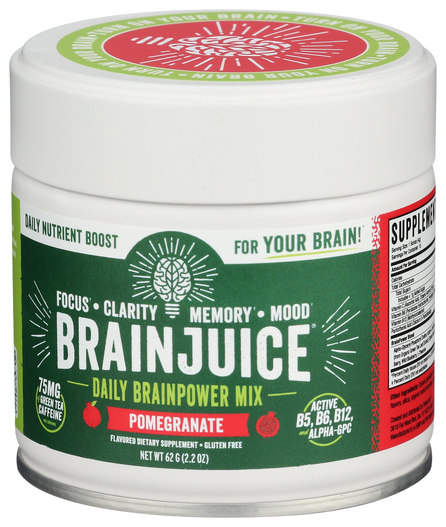 15 servings of great tasting, all-natural, gluten-free BRAINPOWER. BRAINJUICE Pomegranate Daily BrainPower Drink Mix is a delicious fall flavor that should be enjoyed year round! Each serving delivers a nutrient boost for your brain to help improve focus, clarity, memory, mood, and overall cognitive performance. It's delicious in water, or in your favorite smoothie or morning beverage!