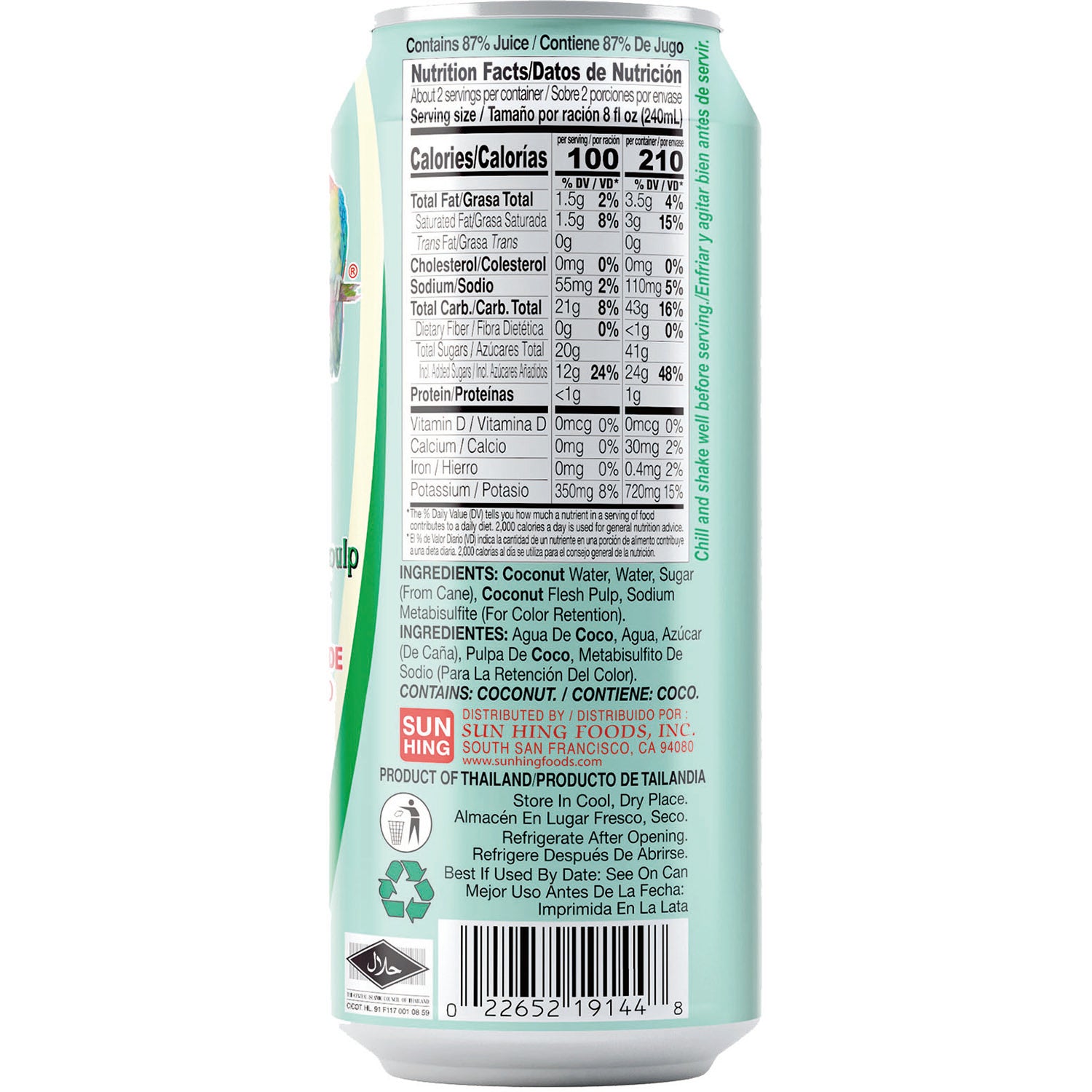 Ingredients: Coconut Water, Water, Cane Sugar (From Cane), Coconut Flesh Pulp, Sodium Metabisulfite (For Color Retention).