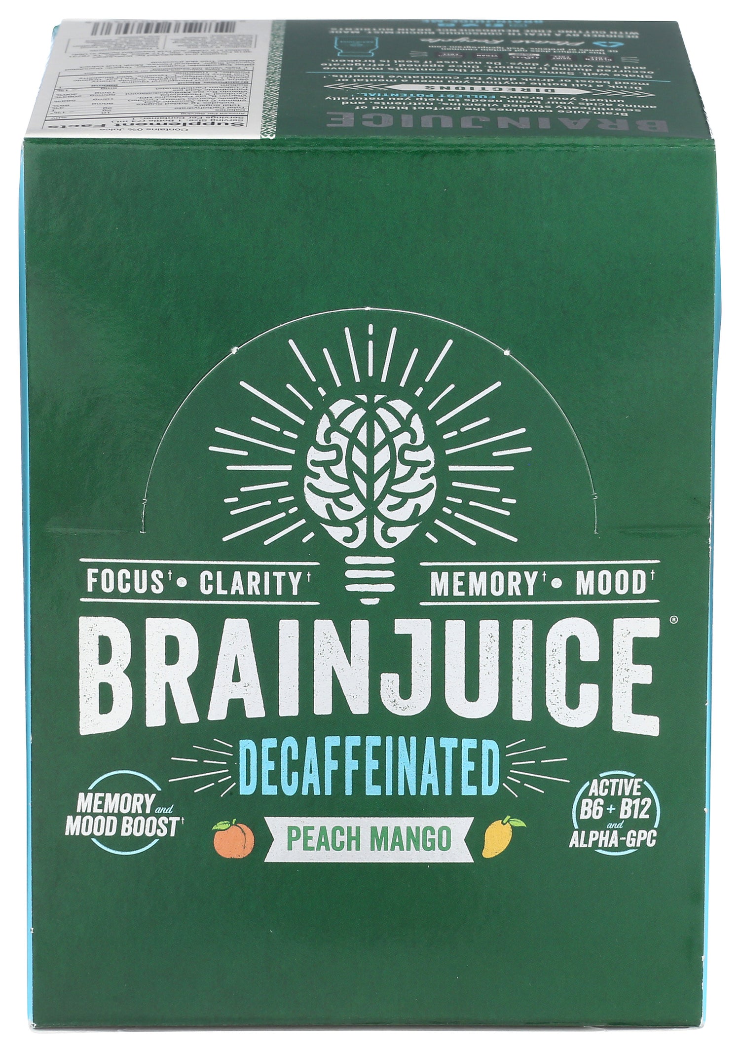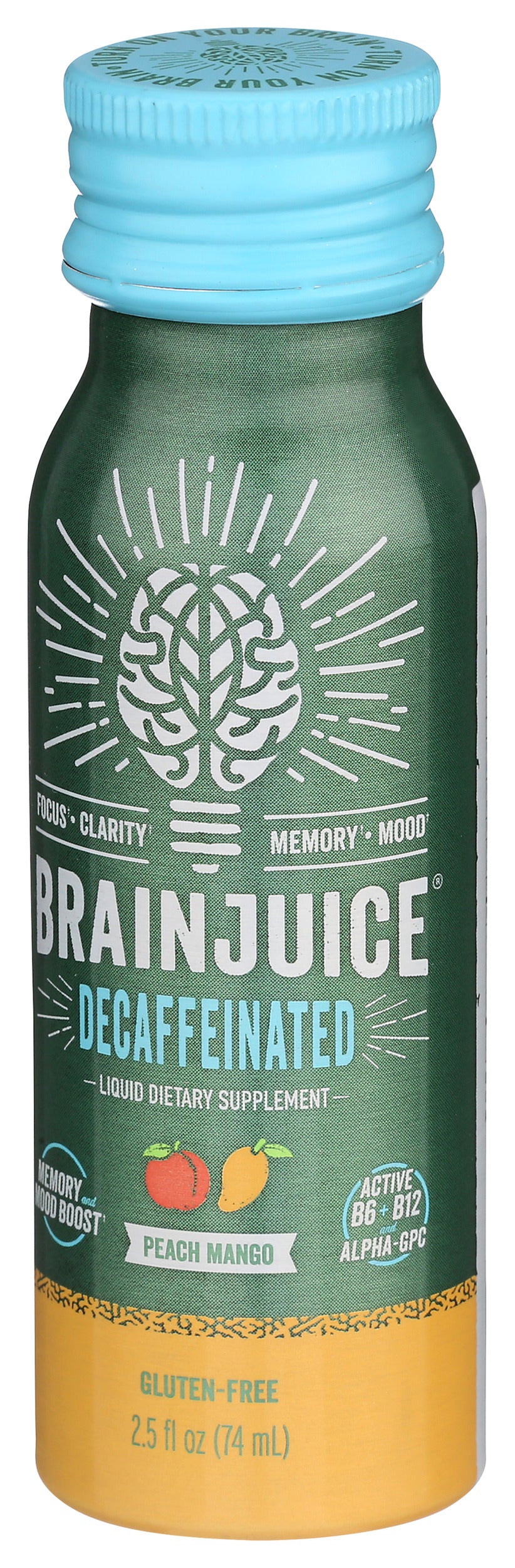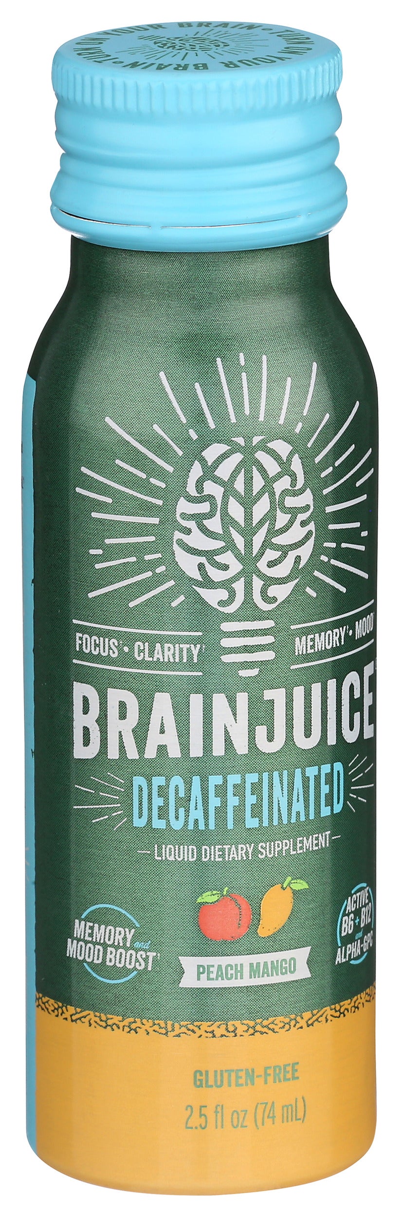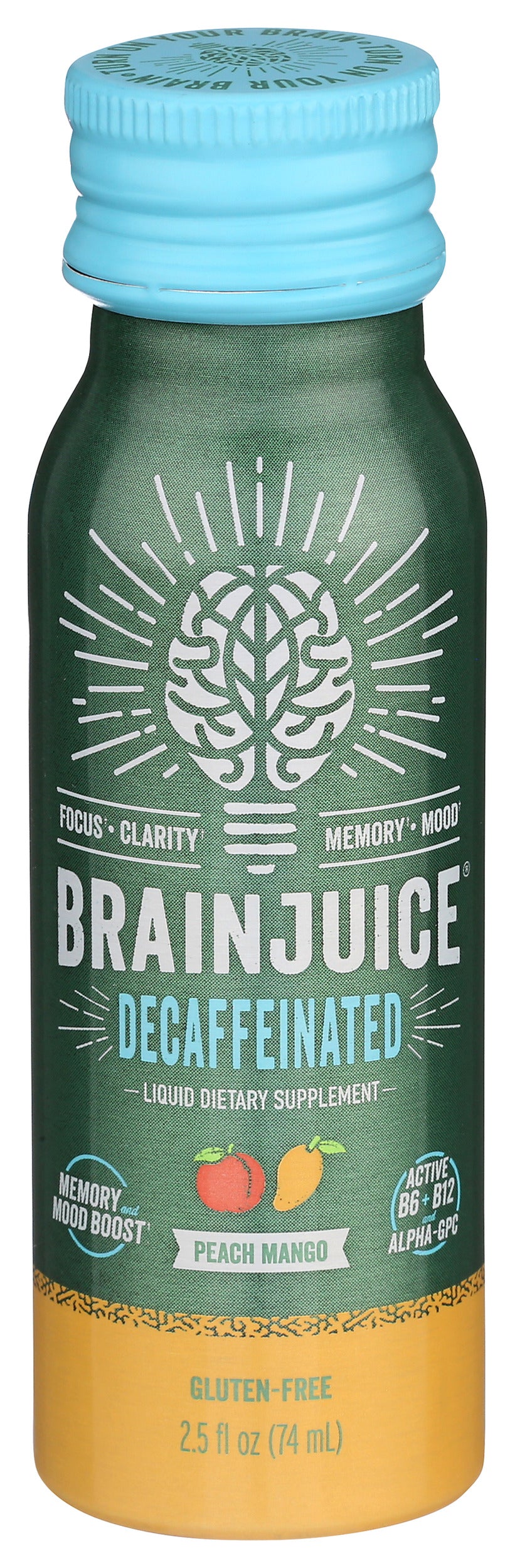 Our BRAINJUICE DECAFFEINATED PEACH MANGO 2.5 oz., a ready-to-drink supplement, is the perfect choice for lovers of the flavors peach and mango who are also looking fora decaffeinated way to support overall brain health and performance. It combines our first delicious flavor with our proprietary BrainPower blend of vitamins, superfoods, and Alpha-GPC. It's BrainPower in a bottle -decaffeinated.