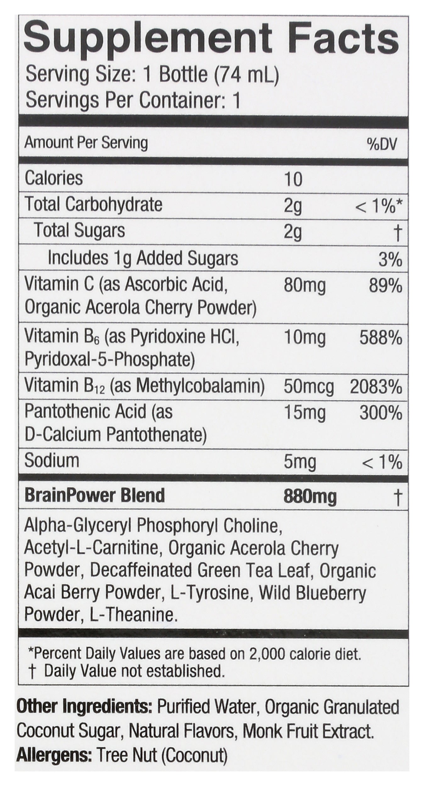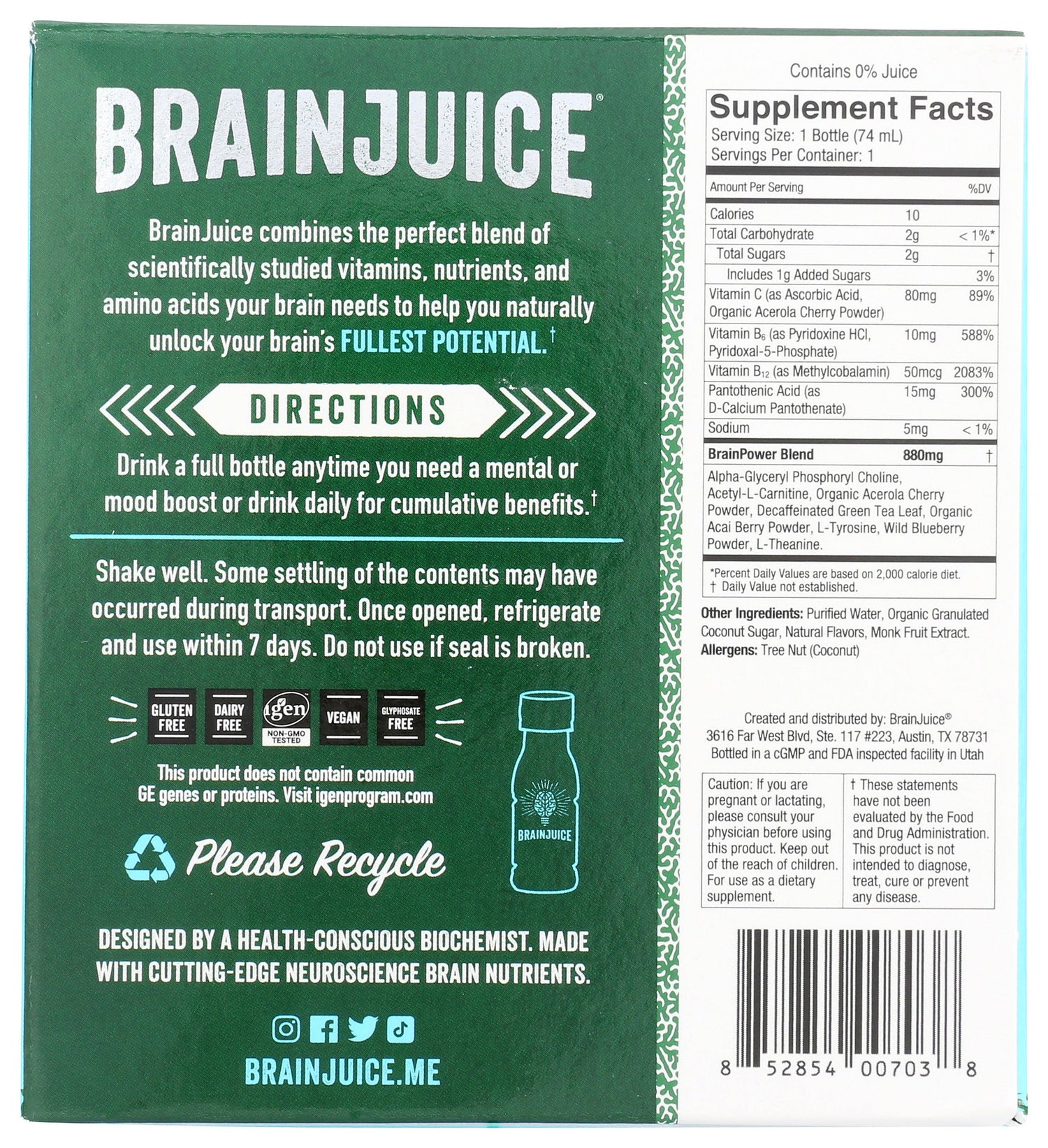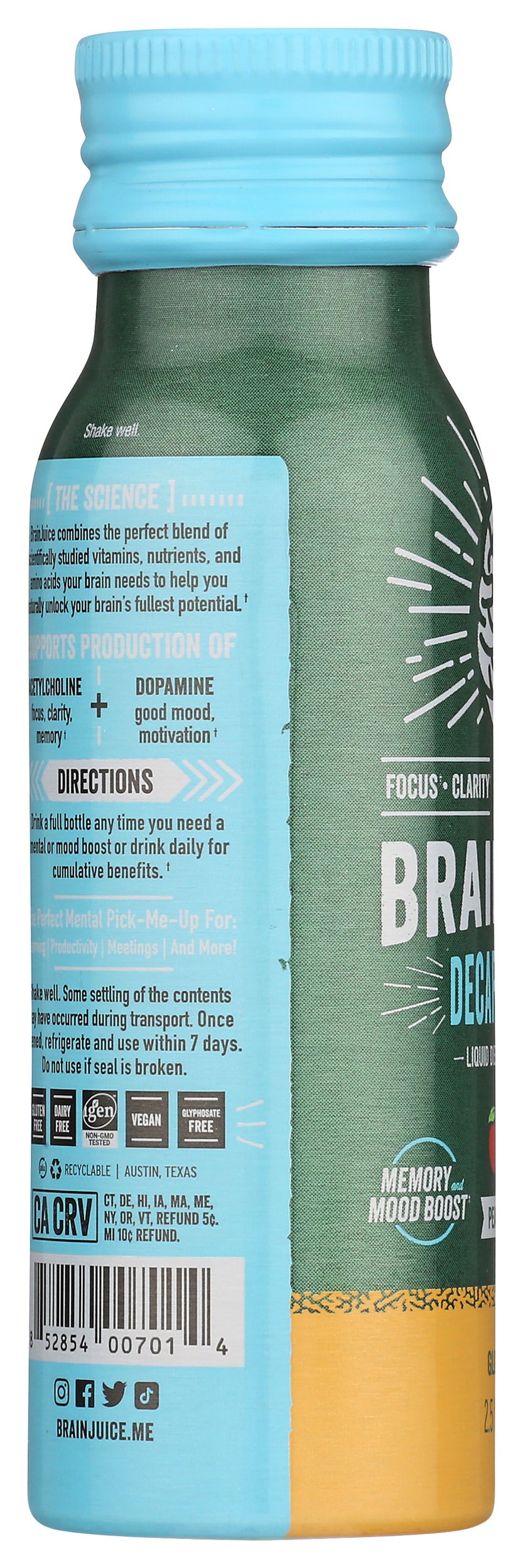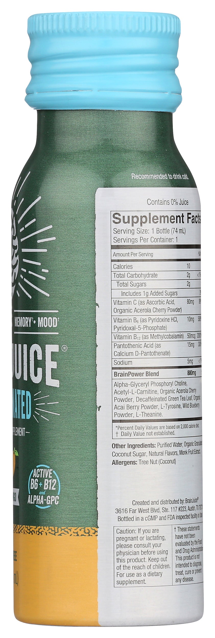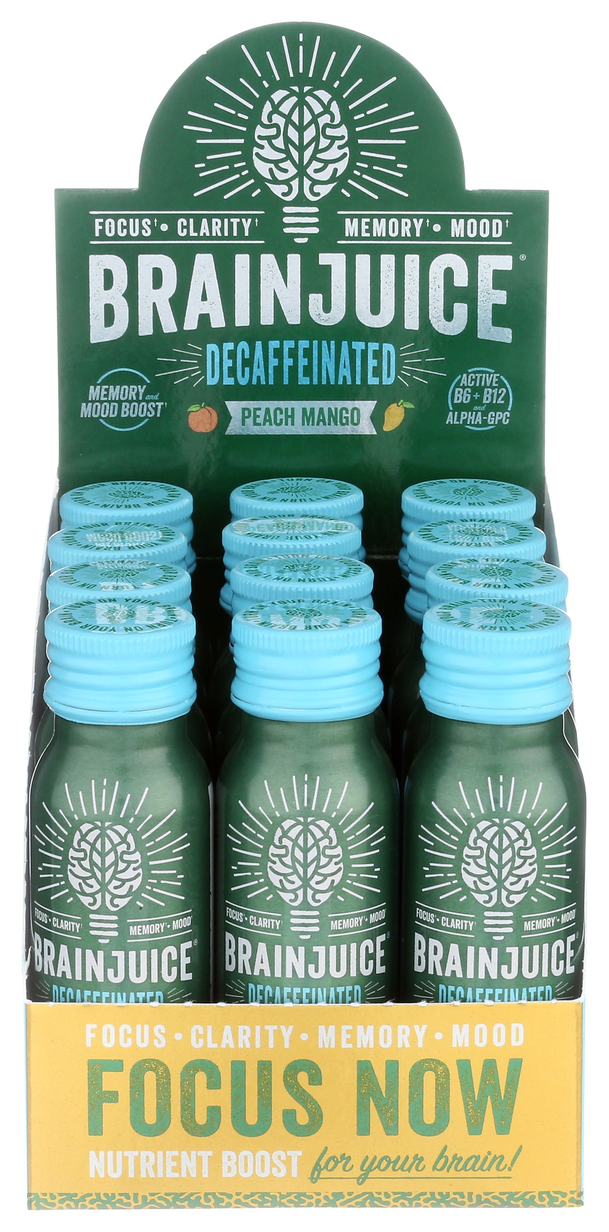 Our BRAINJUICE DECAFFEINATED PEACH MANGO 2.5 oz., a ready-to-drink supplement, is the perfect choice for lovers of the flavors peach and mango who are also looking fora decaffeinated way to support overall brain health and performance. It combines our first delicious flavor with our proprietary BrainPower blend of vitamins, superfoods, and Alpha-GPC. It's BrainPower in a bottle -decaffeinated.