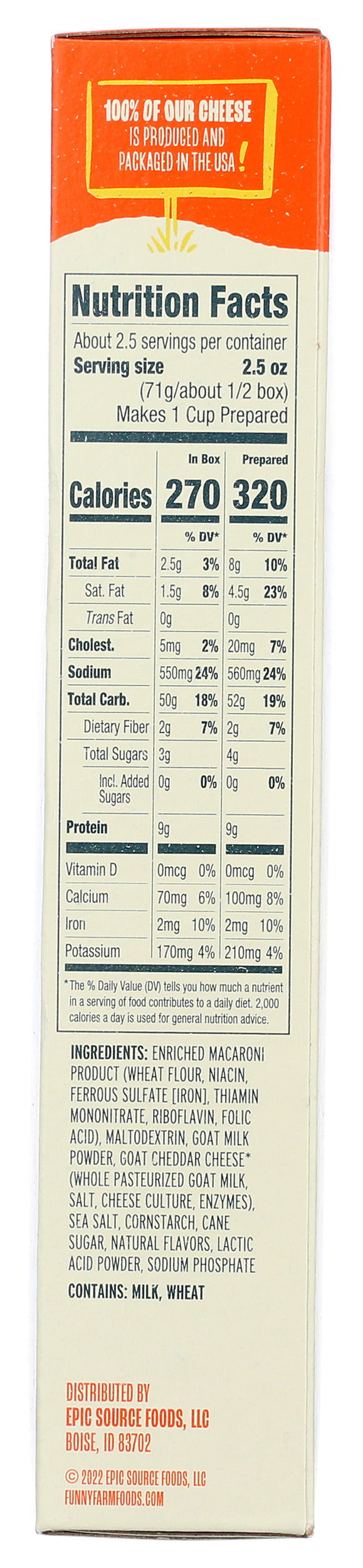 Ultra-creamy and outrageously cheesy, our Goat Cheddar Mac & Cheese is packed with melty goodness in every bite. Add your own favorite goat or plant-based milks and butters to our oodles of noodles for a fresh new approach to comfort food. At Funny Farm, we know goat cheese cheddar makes everything better!