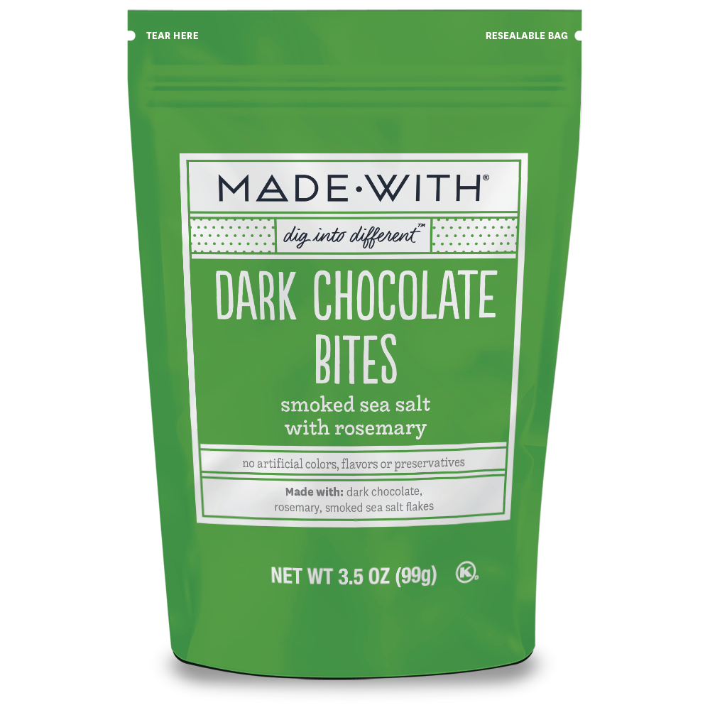 Discover the elegant complexity of Made•With® Dark Chocolate Bites with Rosemary and Sea Salt, where the deep notes of premium dark chocolate converge with the aromatic flair of rosemary and the crystalline sparkle of sea salt.