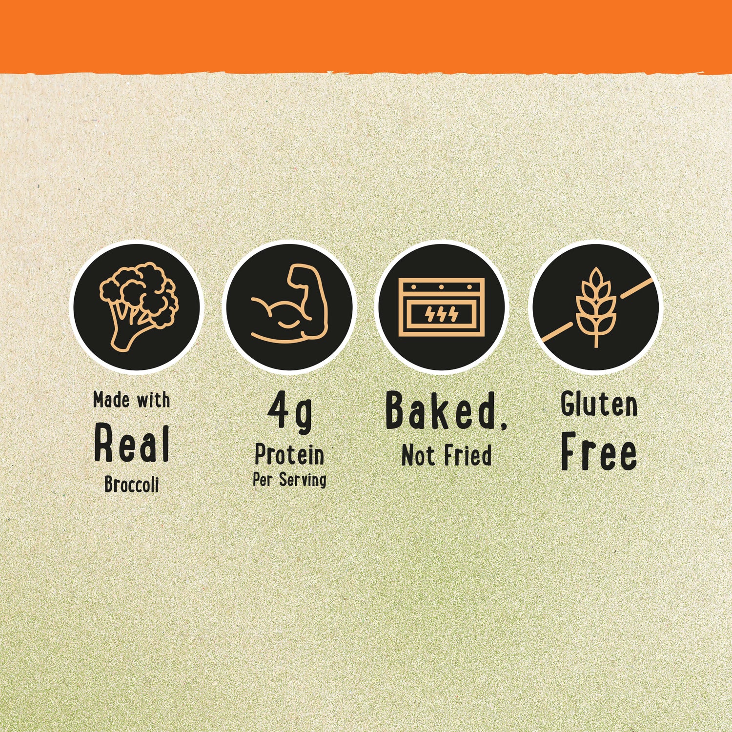 Crunchy puffs made with 4 simple base ingredients: Broccoli, Rice Flour, Chickpea, Pea Protein