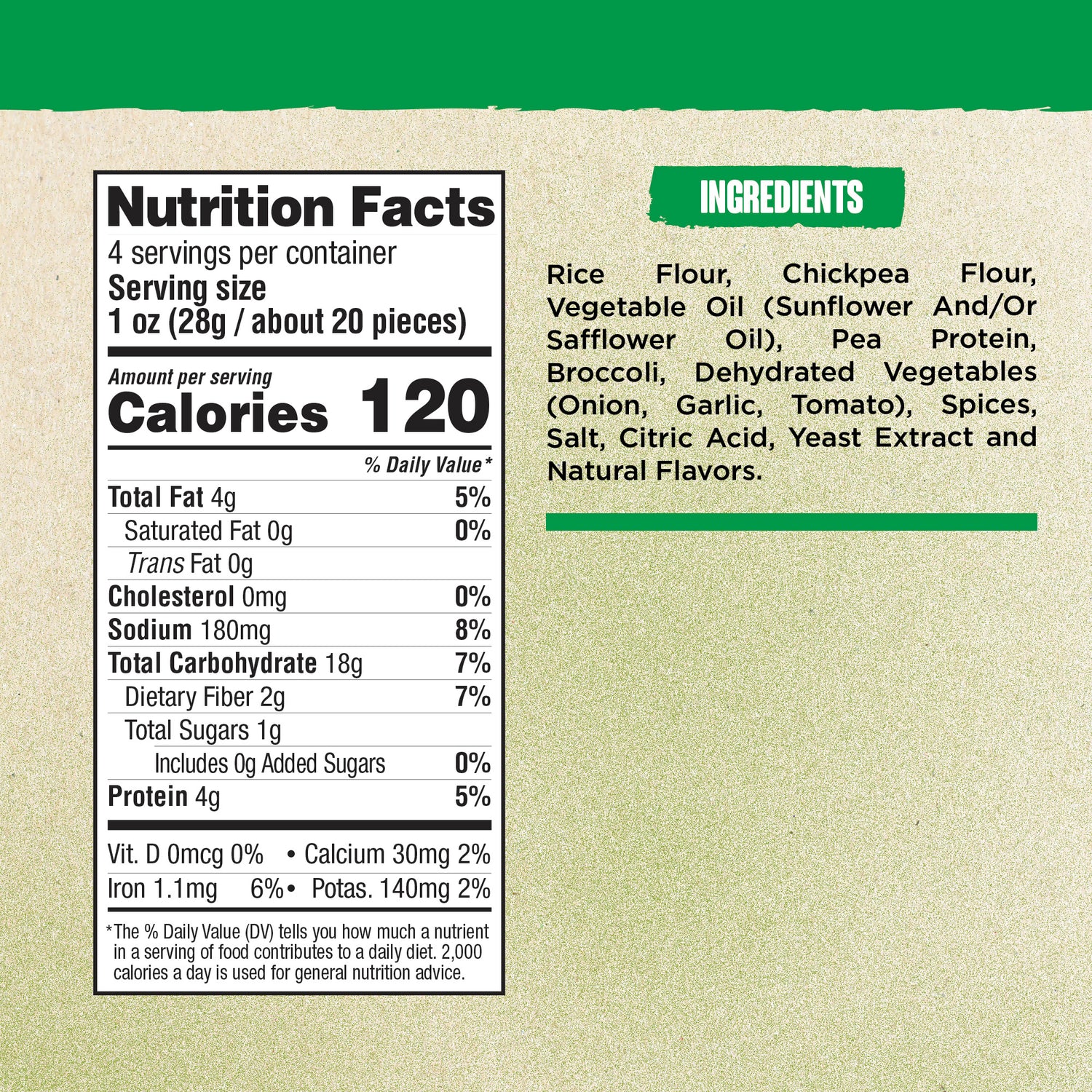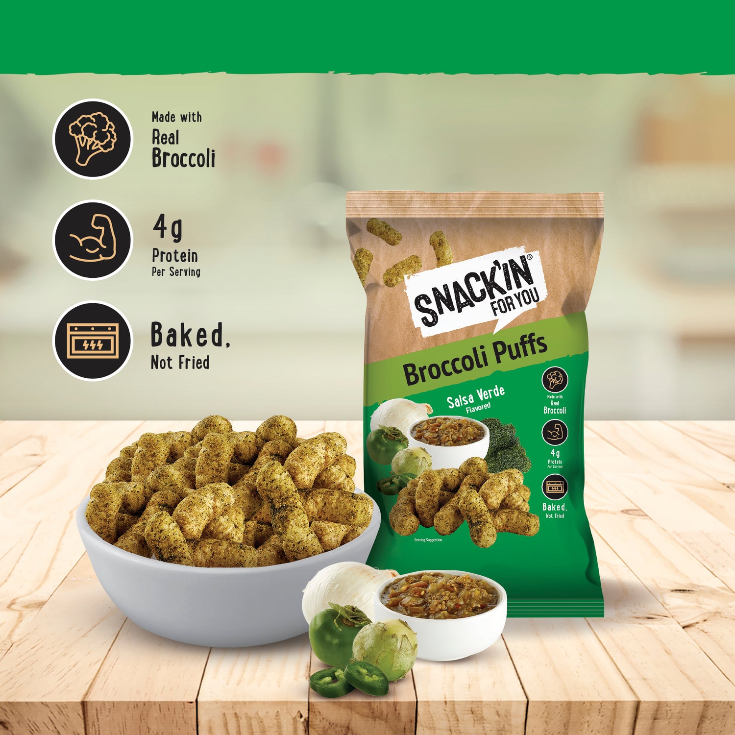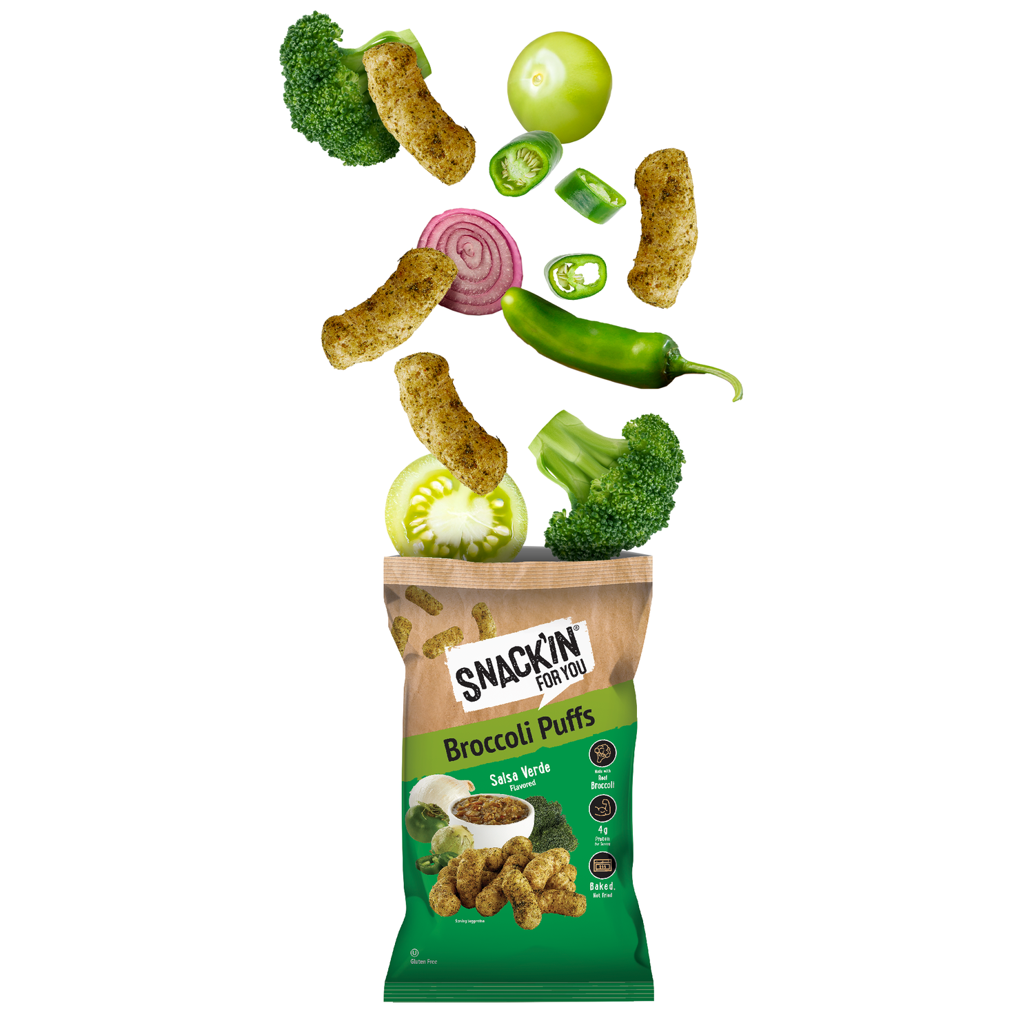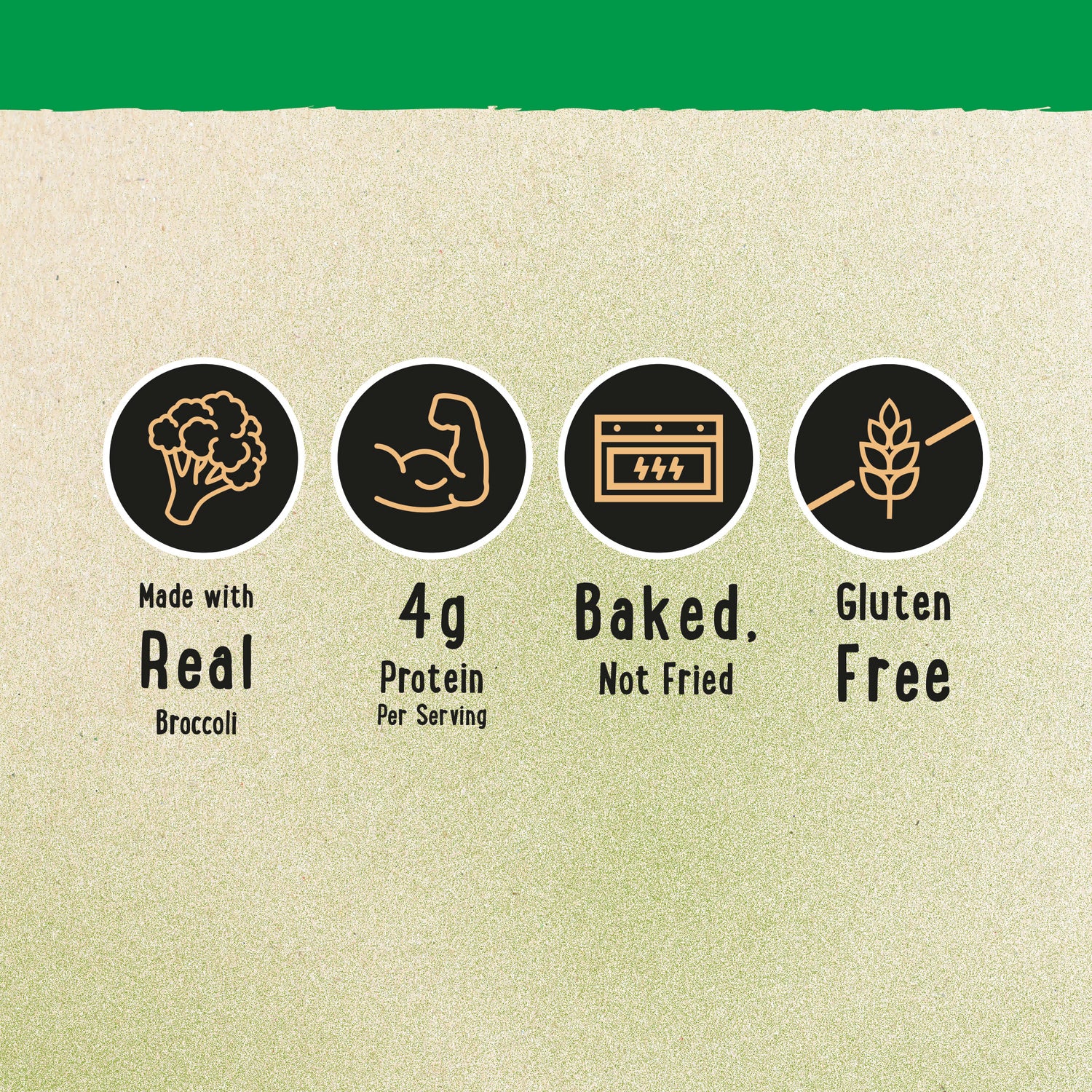 Crunchy puffs made with 4 simple base ingredients: Broccoli, Rice Flour, Chickpea, Pea Protein