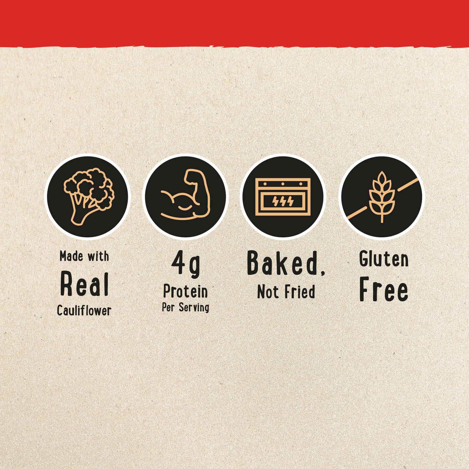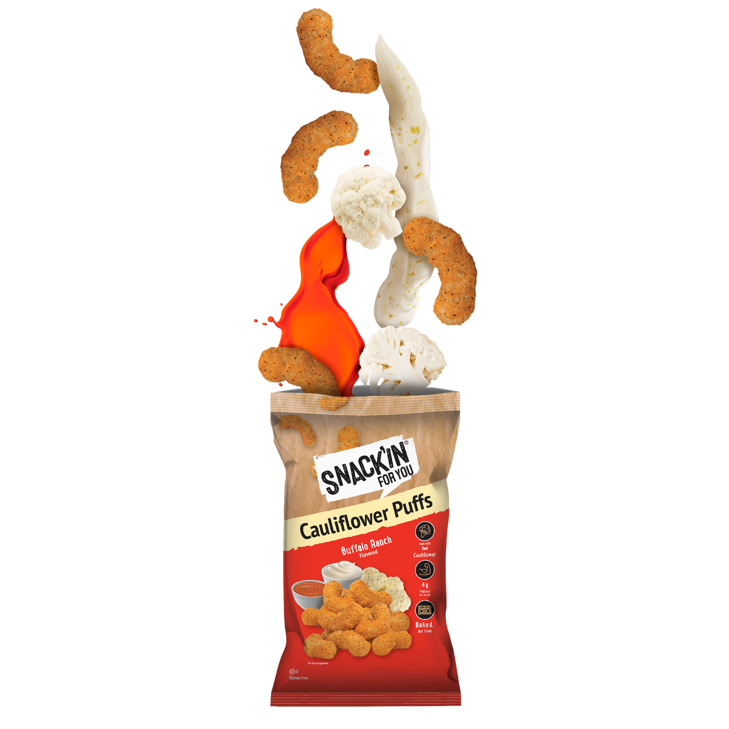 Crunchy puffs made with 4 simple base ingredients: Cauliflower, Rice Flour, Chickpea, Pea Protein