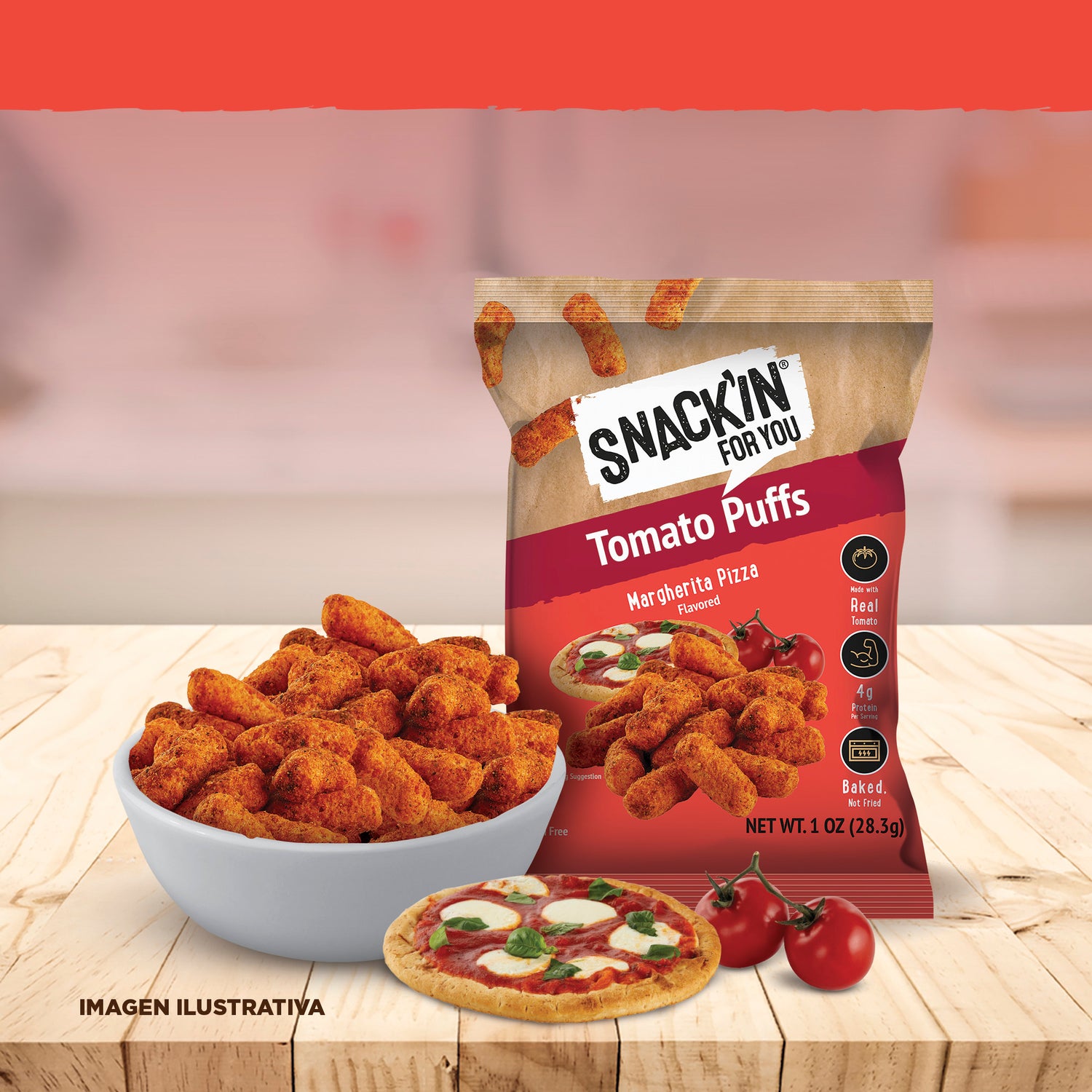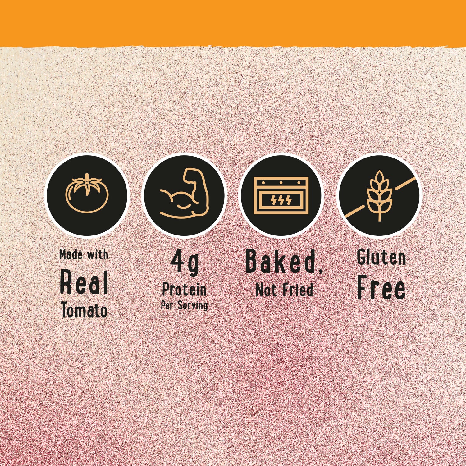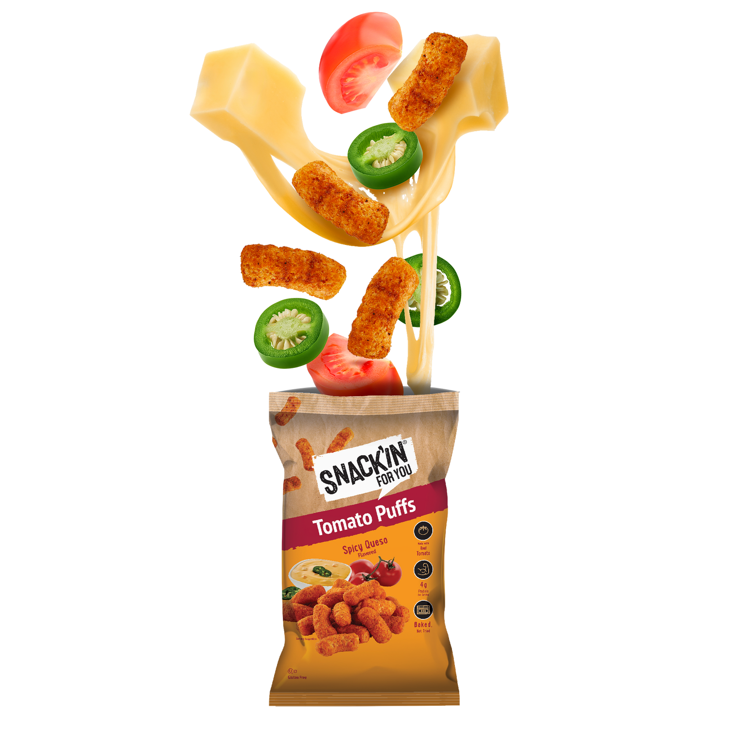 Crunchy puffs made with 4 simple base ingredients: Tomato, Rice Flour, Chickpea, Pea Protein