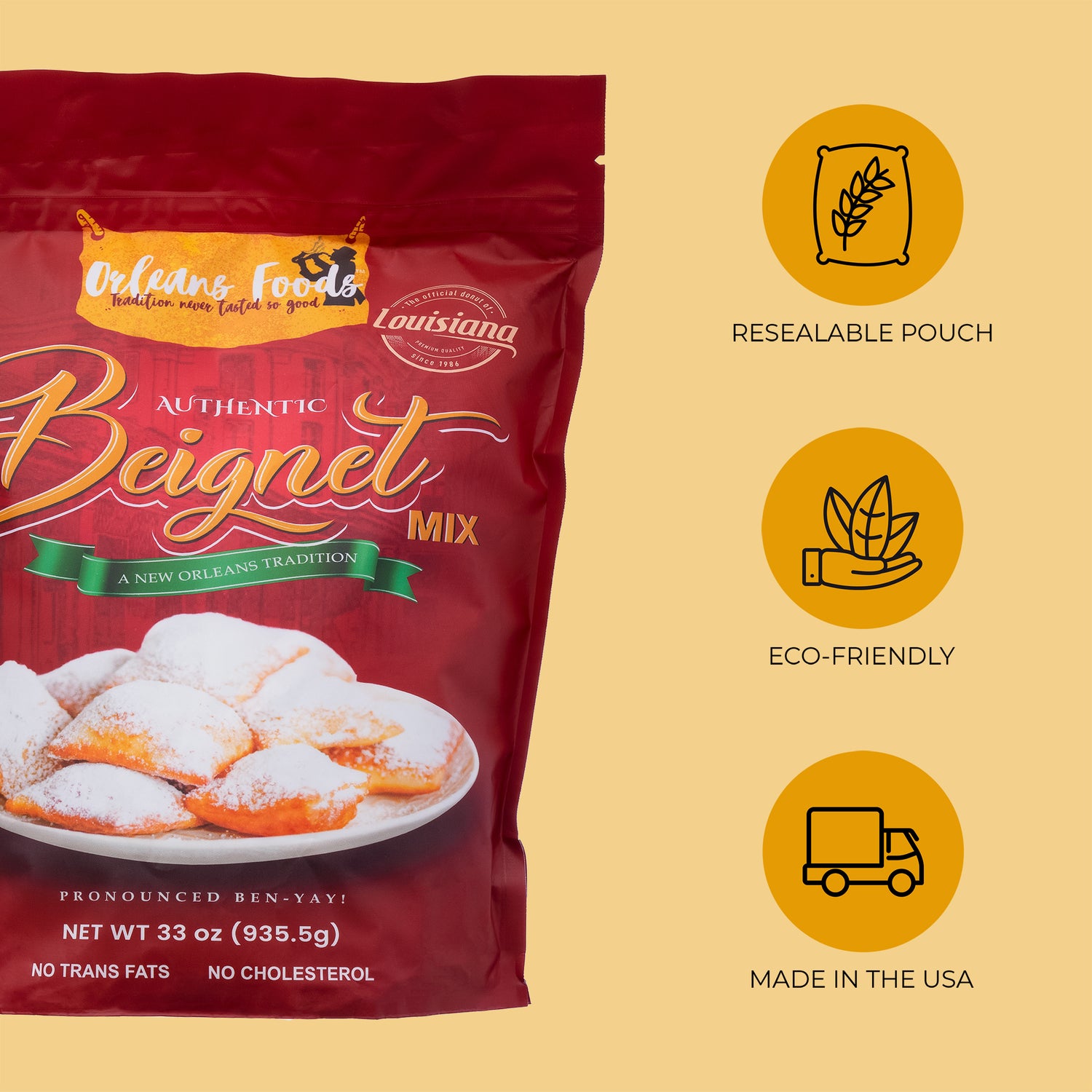 Our mix makes it so easy to make beignets at home that even your kids will want to get in on the fun. Our resealable pouch means you can make as few or as many as you need. Mix the dough, let it rise, roll out and cut the beignets, fry them to perfection and then dust them with the traditional powdered sugar or serve with your favorite dipping sauce. Beignets are perfect for pairing with coffee or hot chocolate. You can also use our mix for amazing pancakes, waffles and batter! Contains no trans fats or cholesterol.
