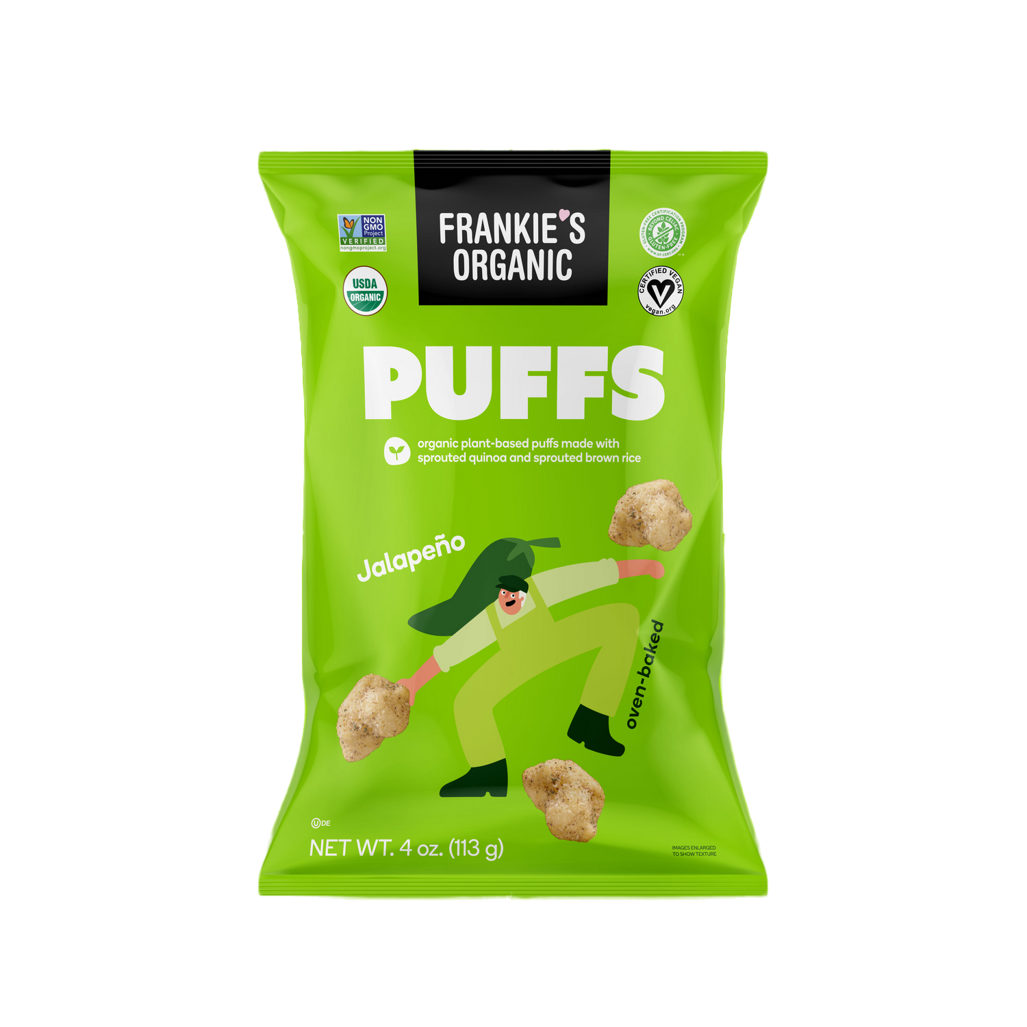 Frankie's Organic Jalapeño Puffs bring the heat. They're light and crunchy with the perfect level of spice and a vibrant jalapeño flavor! Have them as a snack— or finish off the whole bag. These guilt-free puffs are made with good-for-you ingredients like sprouted quinoa and sprouted brown rice. They're also certified gluten-free and vegan without compromising on flavor, making them the perfect snack for everyone.