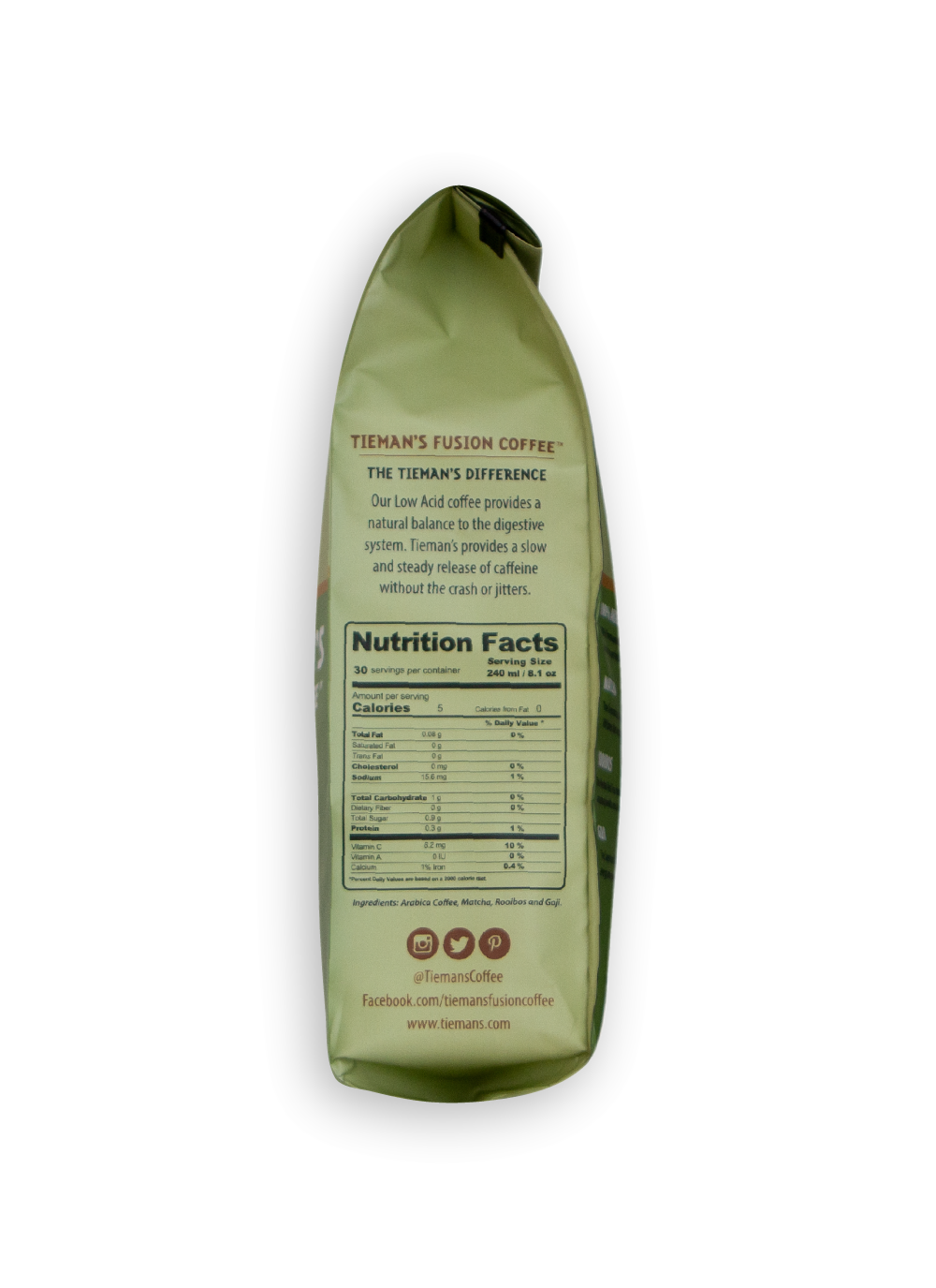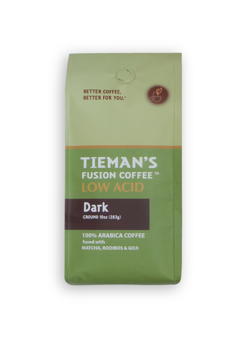 Many of our customers claim that Tieman’s Fusion Dark is the best French Roast Coffee they have ever had. Naturally fused with Matcha Green Tea, Rooibos Red Tea and Goji Berry powders. Low Acid ph 5.97%. Caffeine content 71.11 mg per 8oz. 100% Natural, Whole Super food Antioxidants